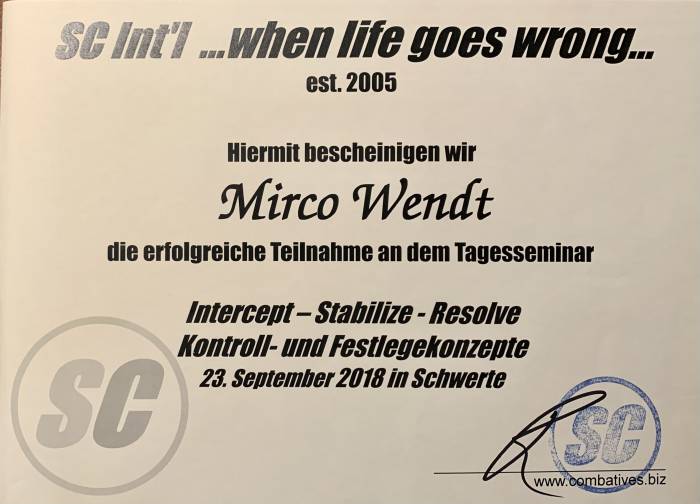 | ISR Matrix- Intercept, Stabilize and Resolve control tactics (Grappling and wrestling based system for physical management & control tactics, founded by Blackbelts Luis Gutierrez and Paul Sharp). Taught by then German ISR Matrix affiliate, Joe Brandt | ![]() |