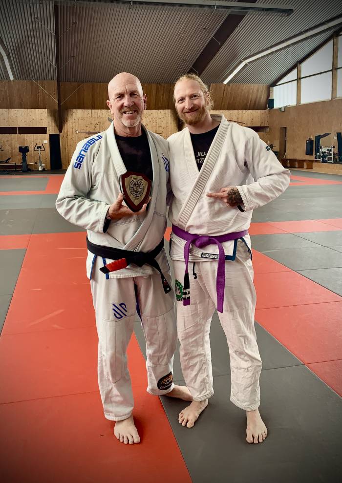 Surprisingly promoted to purple belt by Arlans Siqueira BJJ Blackbelt, Craig Welsh, on a training camp in Oktober 2018. Two Stripes on purple belt awarded in November 2022 by Royce Gracie Blackbelt Roy Marsh, headcoach of Gracie Schwarzwald/Roy Marsh Jiu Jitsu, who i learned from 2018- 2024 as an affiliated instructor of the Roy Marsh Jiu Jitsu branch.