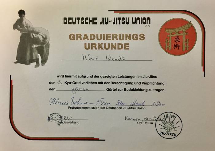 | 1999 my martial arts training journey started with Japanese Jiu Jitsu, as Gracie Jiu Jitsu was non existent at the place where I lived . That’s my Jiu Jitsu yellow belt certificate from 2001 | ![]() |