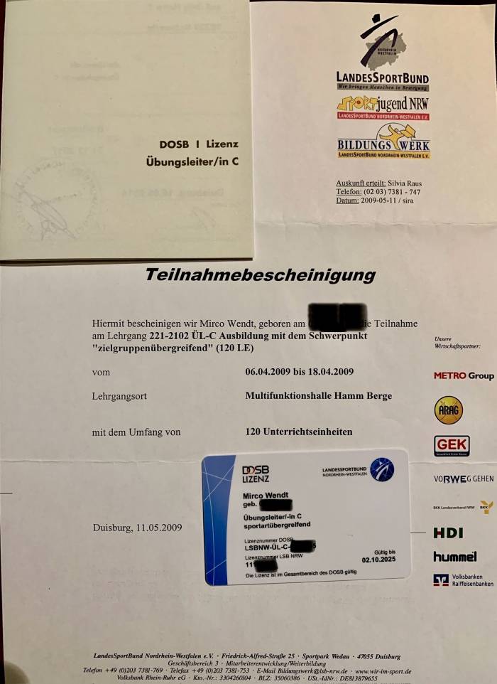 | PT instructor license course German Olympic sports confederation: 120 course units/ Ausbildung Sportübungsleiter C-Lizenz DOSB; 06.04.-18.04.2009 | ![]() |