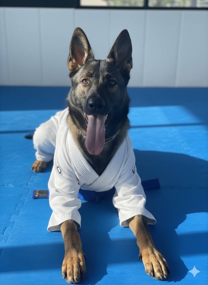 My service dog wanting to join the Jiu Jitsu crowd.. Ok it was AI that put her GI on!