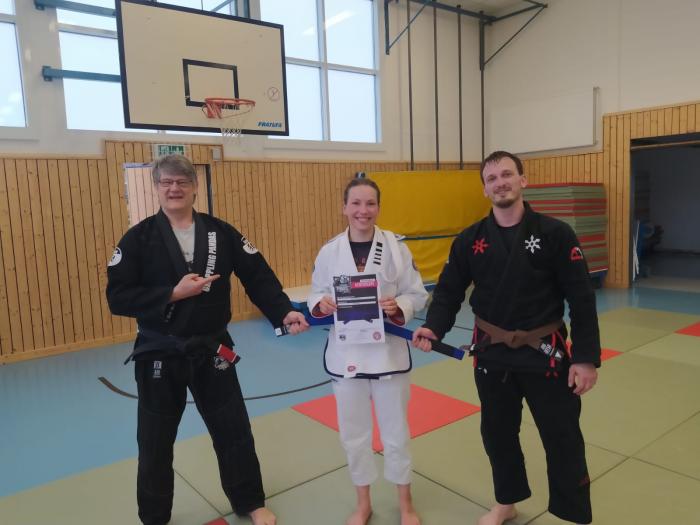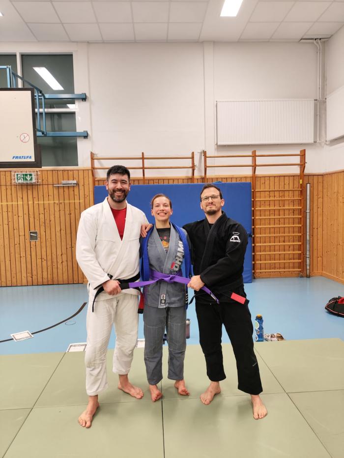 "Svenja has been around for years, first in judo and later also in bjj. She now developed a skilled (and super annoying) game. I also was present at her promotion. Legit purple belt!"