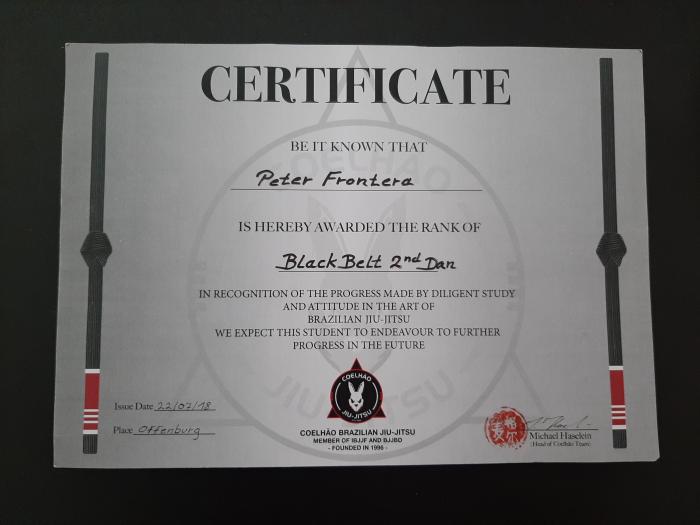 Lineage: Kano Jigoro → Mitsuyo Maeda → Carlos Gracie Sr. → Carlos Gracie Jr. → Michael Haselein → Peter Frontera