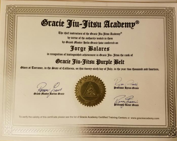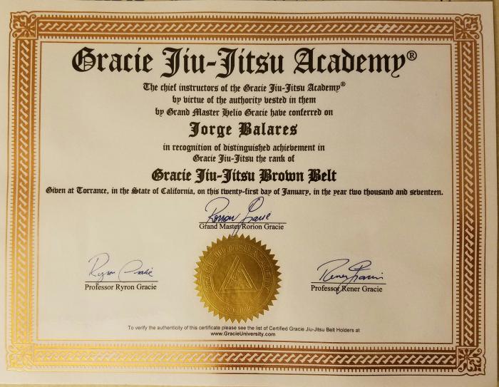 "I don't know Jorge personally, but extensive photos of promotion history provided, including certificates. "