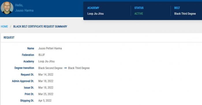 IBJJF issued degree transition from 2nd to 3rd degree black belt.