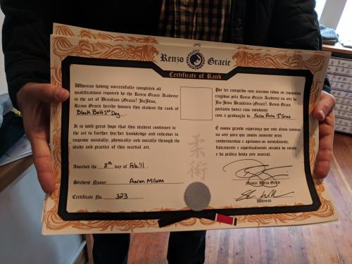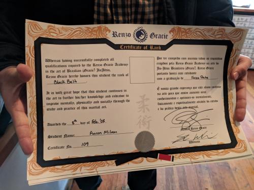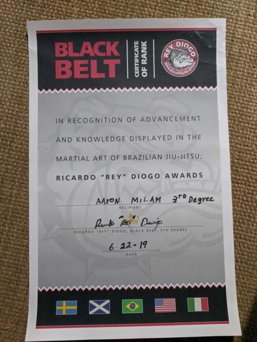 "Aaron’s progression aligns with time-in-belt norms: Renzo Gracie Academy Portland and Workshop bios corroborate a 2000 start under Rey Diogo and a 2008 black belt under John Danaher. IBJJF Pan No-Gi 2008 results also show Aaron medaling at adult black belt for Renzo Gracie. Old school Carlson Gracie style Ray Diogo has been a black belt since 1997 and personally known to me, more than sufficient to award a black belt as of 2008. Legit!"